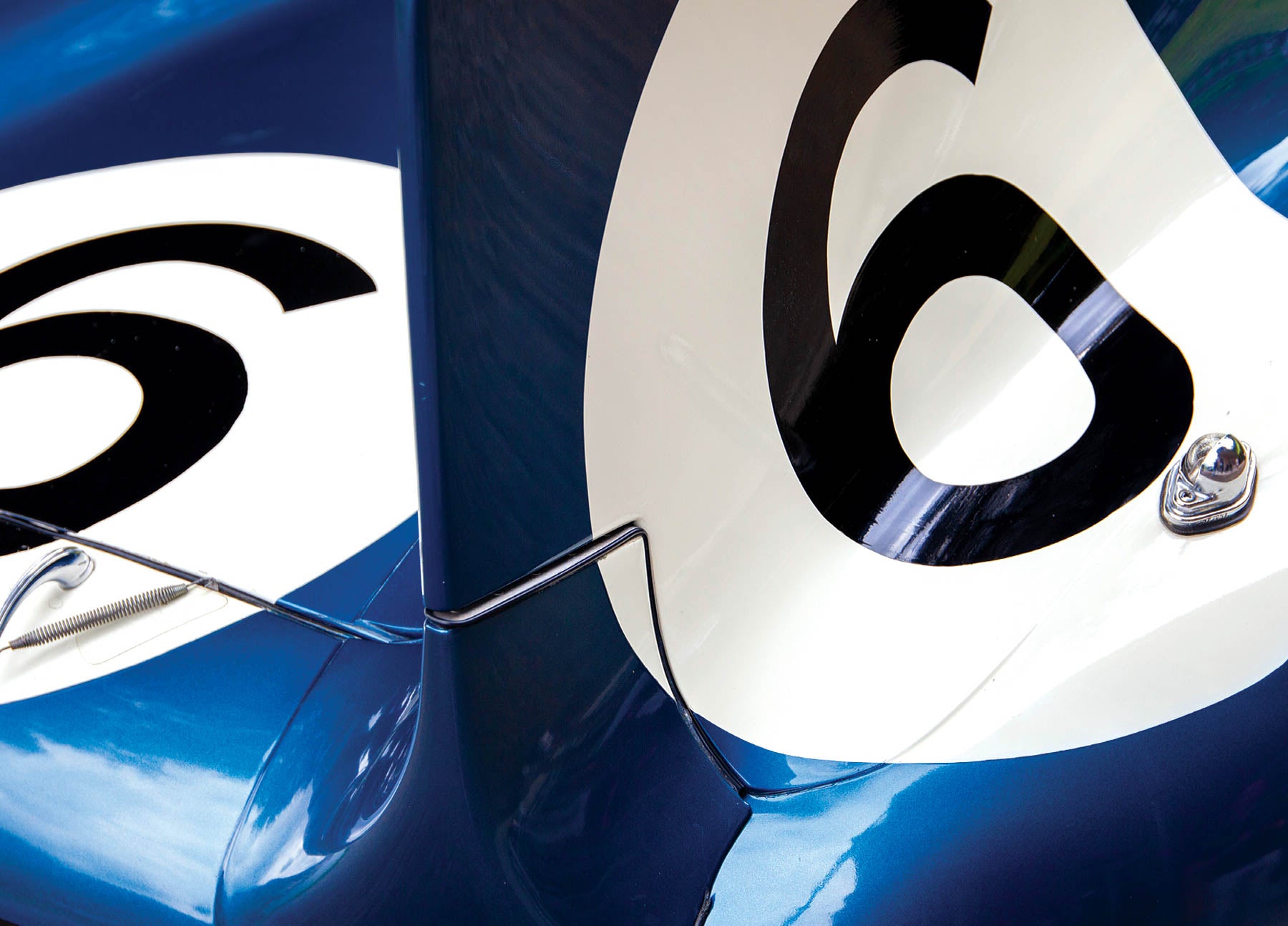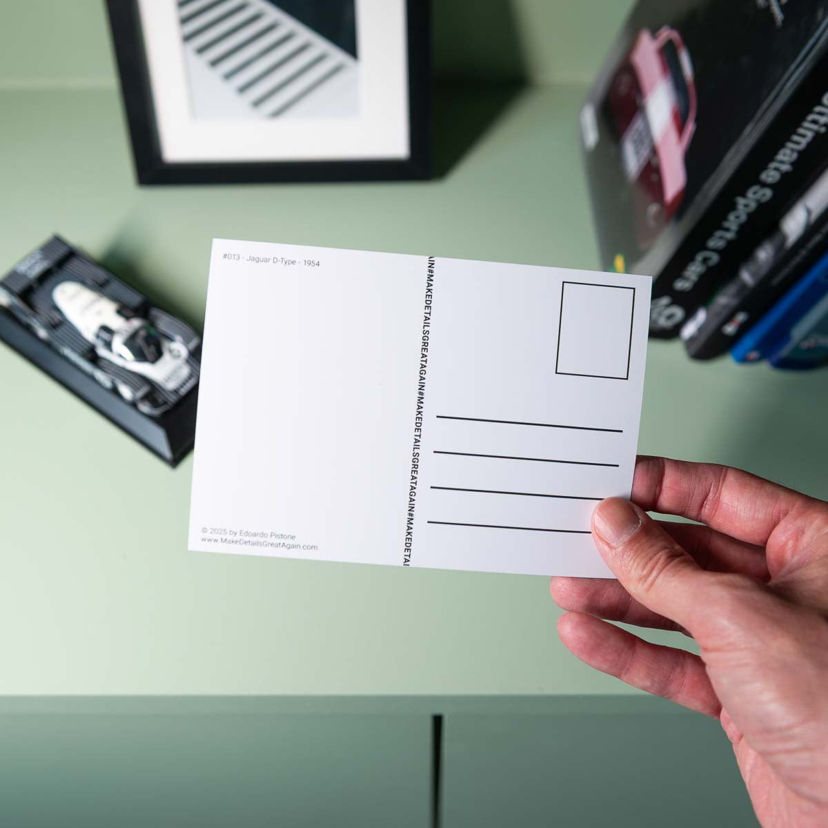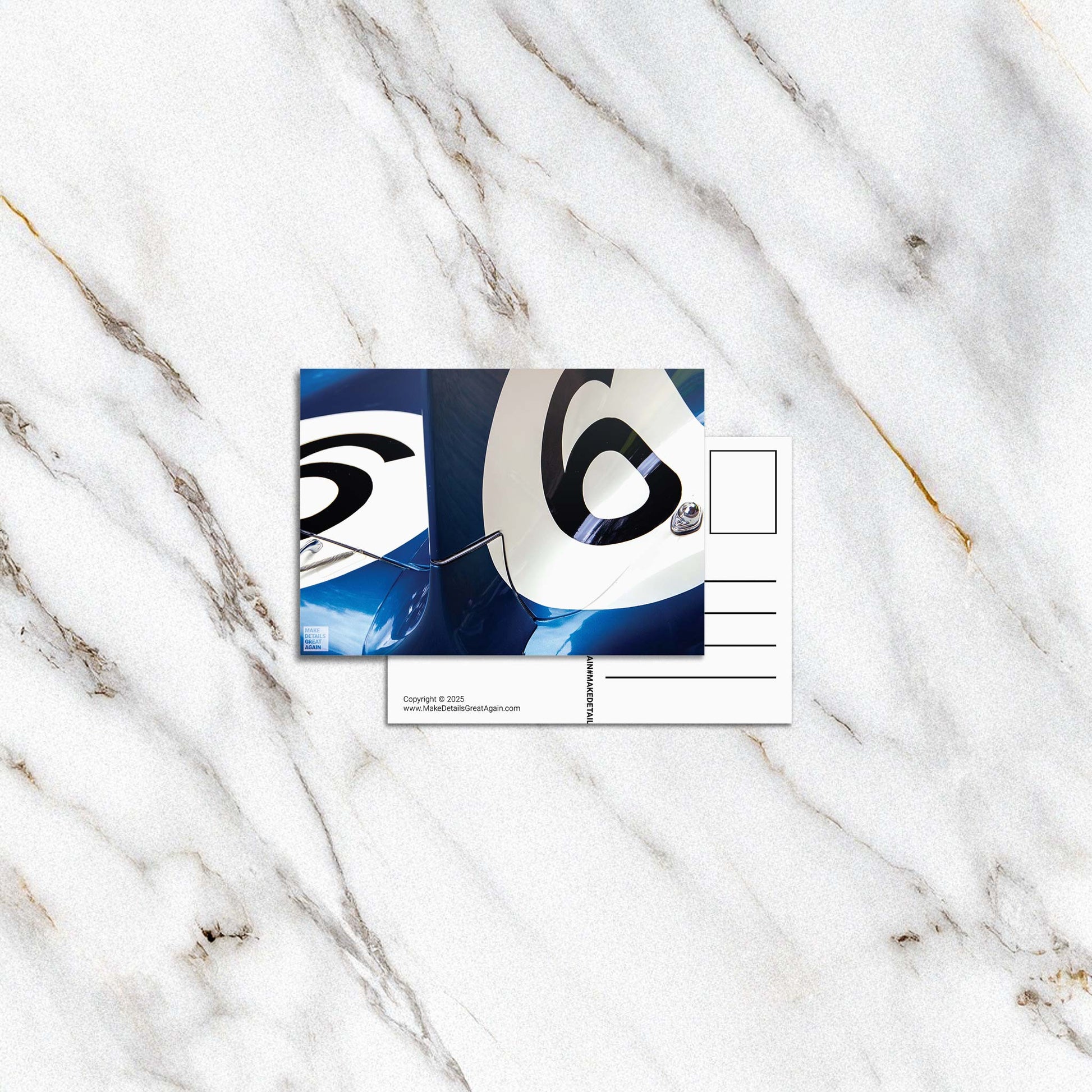 Celebrate the artistry of automotive design with this stunning postcard featuring a close-up detail of the classic Jaguar D-Type.