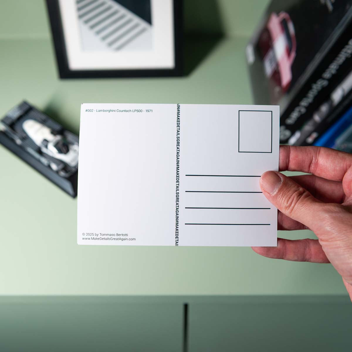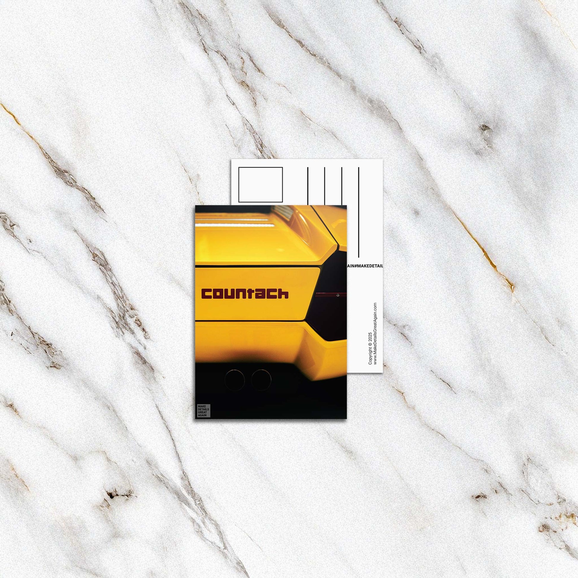 Celebrate the artistry of automotive design with this stunning postcard featuring a close-up detail of the revolutionary Lamborghini Countach LP500.