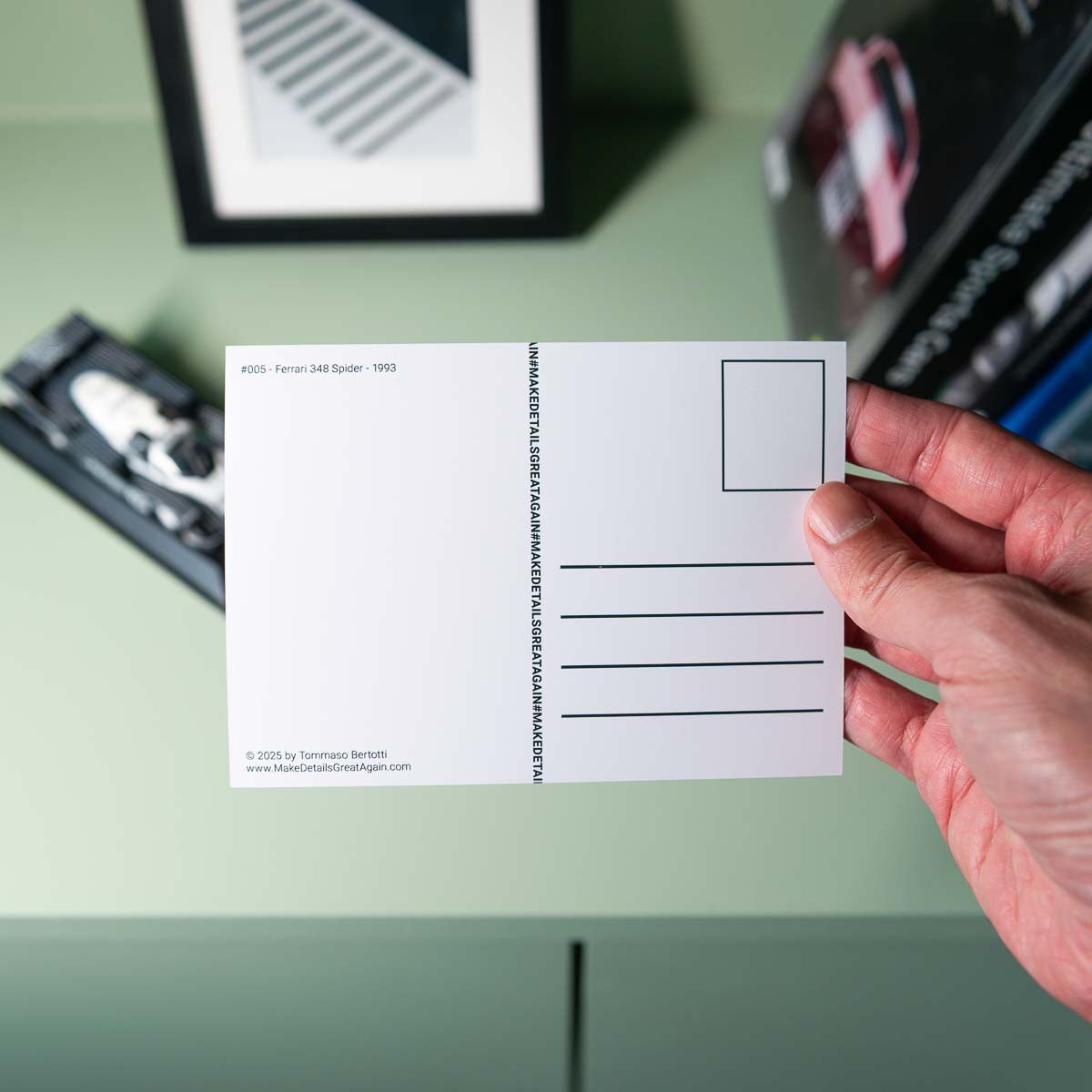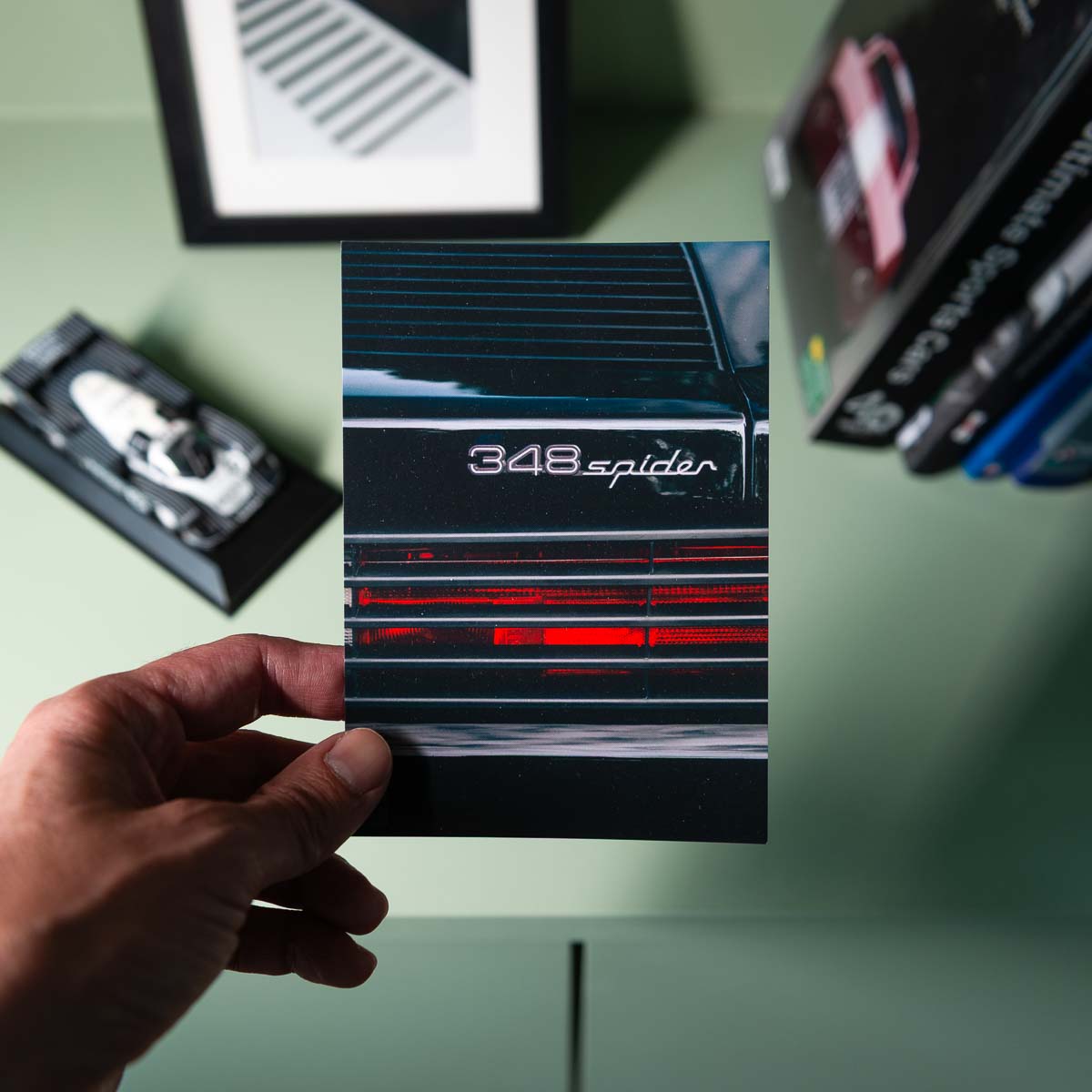 Celebrate the artistry of automotive design with this stunning postcard featuring a close-up detail of the boxy 348 Spider.